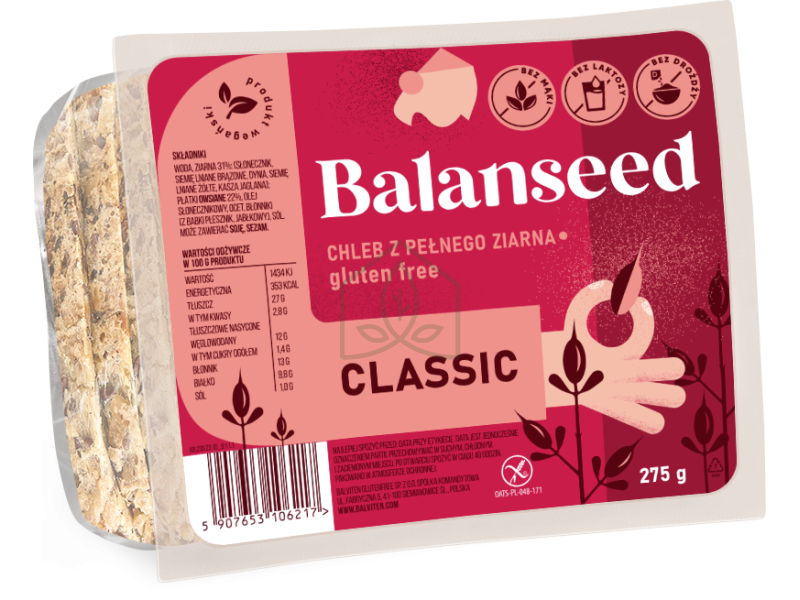 woda, ziarna 31 % (słonecznik, siemię lniane brązowe, dynia, siemię lniane złote, kasza jaglana); płatki OWSIANE (bezglutenowe) 22 %, olej słonecznikowy, ocet, błonniki (z babki płesznik, jabłkowy), sól.