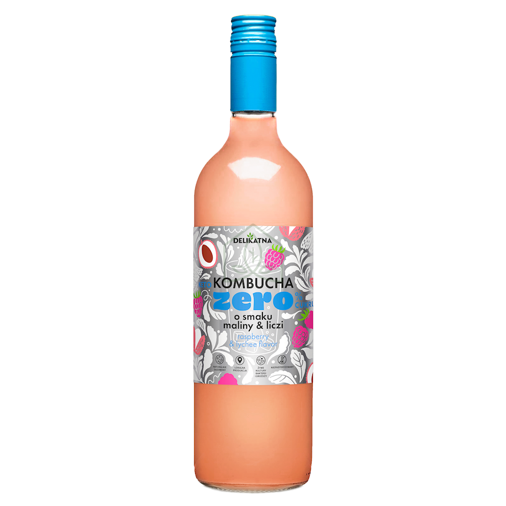 Kombucha o Smaku Maliny i Liczi Zero % Cukru 750 ml Delikatna