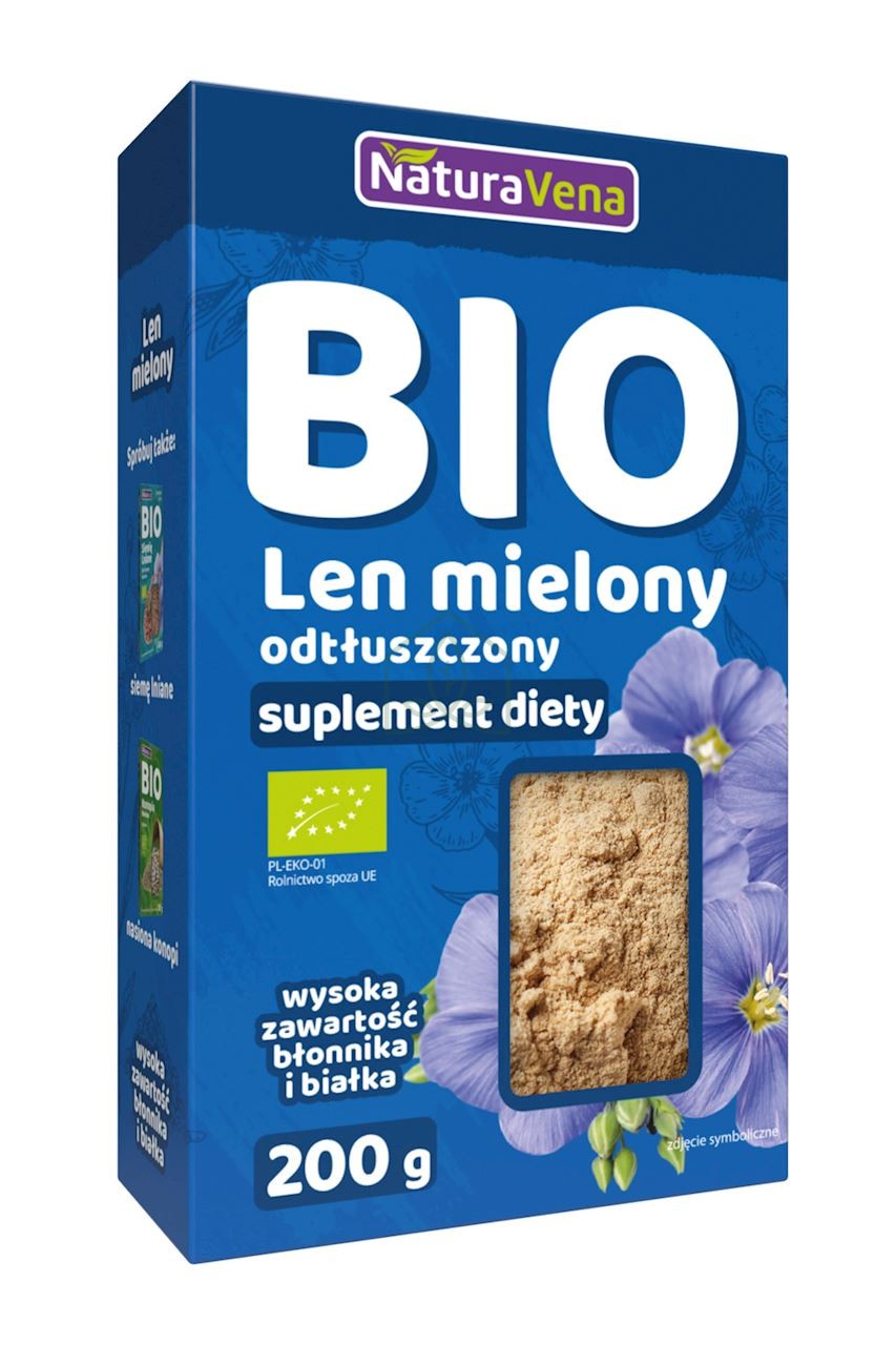 odtłuszczone, mielone ziarna lnu pochodzące z kontrolowanych, certyfikowanych upraw ekologicznych