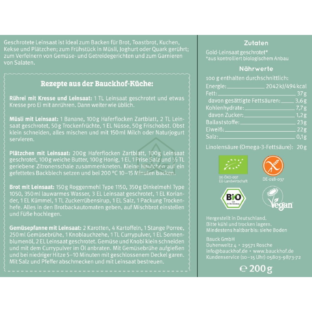 Mielone siemię lniane idealnie nadaje się do pieczenia chleba, tostów, ciast, herbatników i herbatników; Dodawany do musli, jogurtu lub twarogu na śniadanie, do uszlachetniania potraw warzywnych i zbożowych oraz do przybrania sałatek. Na opakowaniu znajdziesz wariacje i wskazówki dotyczące przepisów z kuchni Bauckhof.