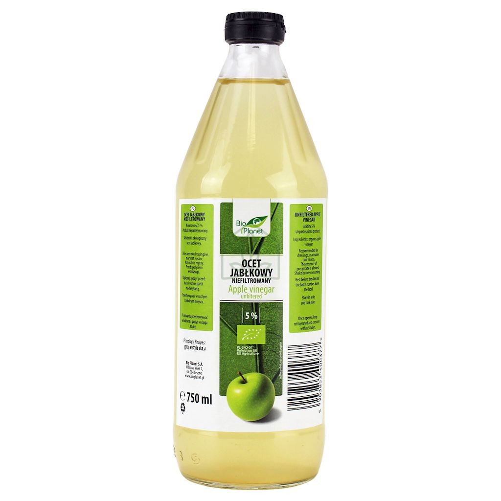 Ekologiczny ocet jabłkowy 5% kwasowości. Do bezpośredniego użycia rozcieńczyć w stosunku 1:1. Produkt niepasteryzowany, naturalnie mętny. Wstrząsnąć przed spożyciem.