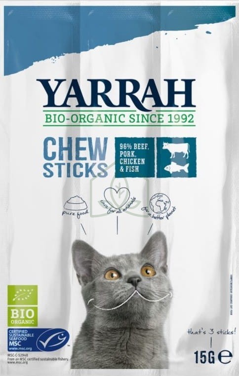 Pyszna przekąska dla kotów składająca się z trzech paluszków do żucia z kurczakiem i rybą MSC o łącznej zawartości 95% mięsa dla wszystkich typów kotów, od kociąt po starsze koty. Prawdziwa uczta dla Twojego kota! Bardzo apetyczna przekąska dla kota z organicznym mięsem. Tylko czysta żywność, wolna od sztucznych dodatków, pestycydów i GMO. Koty lubią jeść gryzaki. Sztyft można podać w całości lub podzielić na mniejsze kawałki. Paluszki do żucia są suszone ciepłem z generatorów, które są używane do produkcji innych produktów. To sprawia, że organiczna przekąska dla kotów jest produktem przyjaznym dla środowiska.